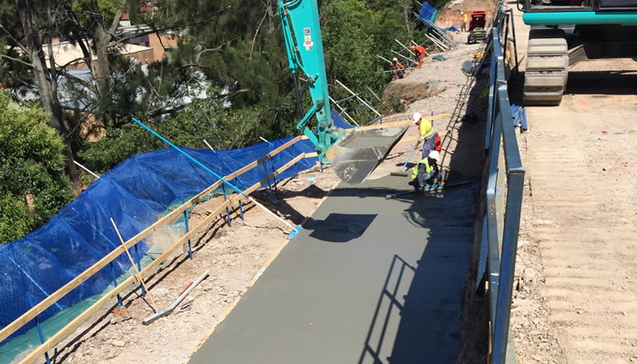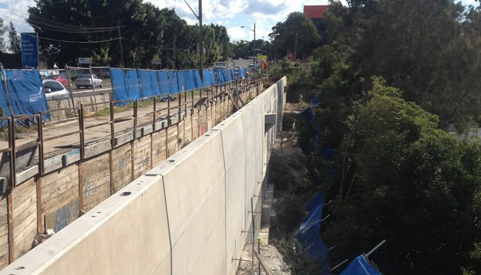 - Work Achieved:A detailed dilapidation report, utilities assessment, surveying, temporary safety fencing (using abseilers) and gantry construction on the side of the cliff face, excavation, piering, reo fixing, concreting, piering, structural steel fabrication/erection, concrete panel construction/erection, handrails and backfilling. Perfect Engineering also coordinated and directed the geotechnical, anchoring, panel connection and general redesign of the major aspects of the project with the approval of the RMS and GHD